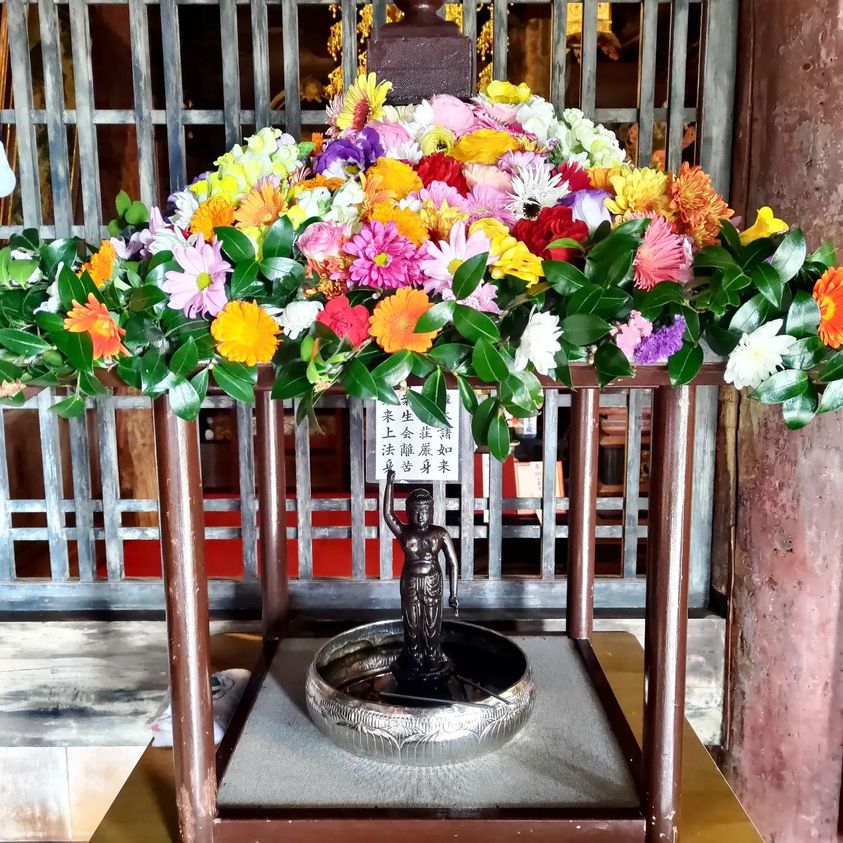 今日は花まつり(お釈迦様の誕生日)。花御堂は今年もきれいなお花で飾れました